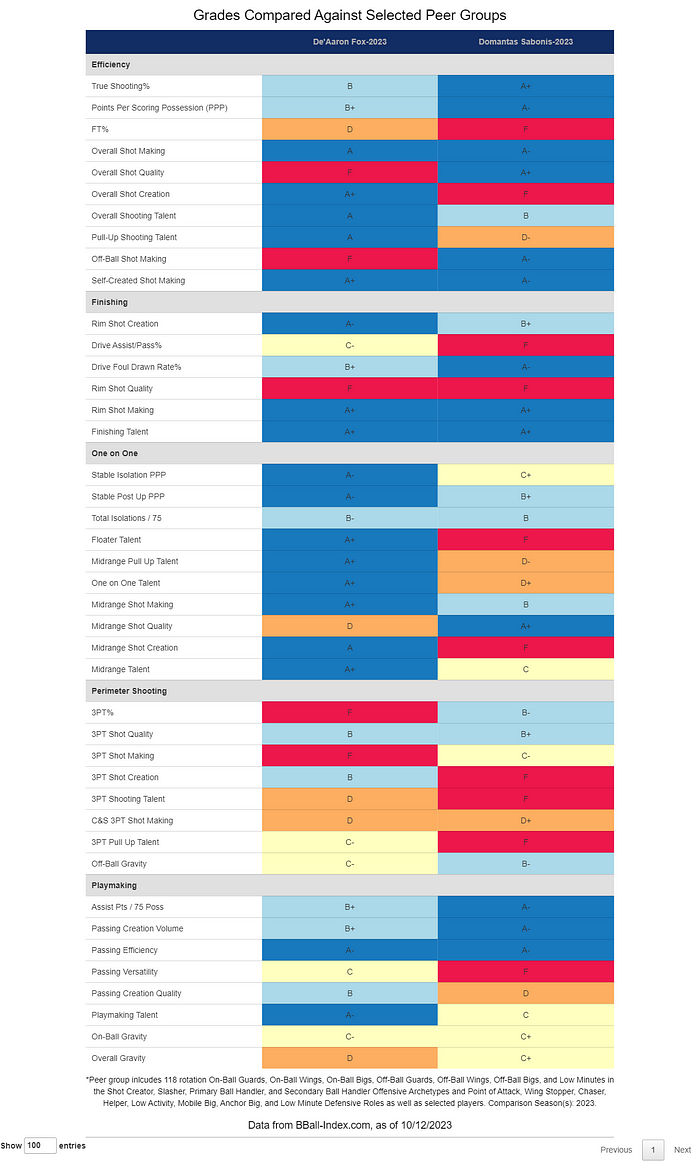 With both Sabonis and Fox, they had a 123.7 offense in 1643 minutes with 37% from 3. They didn’t have wild 3-point noise. They were just great everywhere. They shot almost 60% from 2! They got to the rim, got to the paint, low long mid-range attempts but efficient. No area was inefficient.