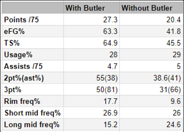 With Butler on: 109.9 offensive rating with 39.8% from 3
